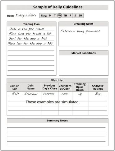 This Trading Logbook and Journal was designed by a group of professional traders known as the Million-Dollar Margin Club. These logbook pages contain far more than any other logbook including the exact headings and information on each page used to trade. With specific details and room to log your entries. The daily Guideline pages include Watchlist categories designed by professional traders to help you find the right cryptocurrencies to trade each day, such as, breaking news, market conditions, change % at the open, trending currency up or down, analysts' ratings, and the previous day's closing price. Other information included, helps you understand cryptocurrency in the market, and details the top 10 rules for trading. There is a very useful glossary of cryptocurrency trading terms and lots of room for a daily trading plan and notes for each day. Inside: Exclusively from the Million-Dollar Margin Club are TEN PROFITABLE TRADING STRATEGIES USED IN WORLDWIDE COMPETITIONS! Any serious trader will want this logbook just for the information inside, when you include the professionally designed watchlist and log pages, it's a must own.