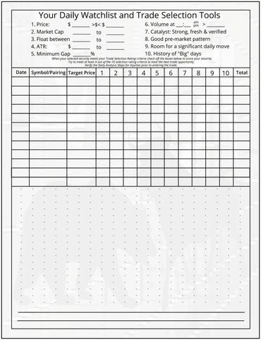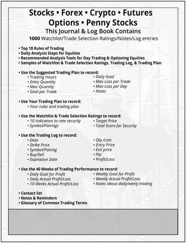 Designed by a group of professional traders from the Million-dollar Margin Club for ease of use while actively trading, this Trading Journal Log Book is a perfect tool for any type of trading you do. It includes 1000 watchlist and log entries for Stocks, Forex, Crypto, Options, Futures, and Penny Stocks and so much more. This unique log Book also offers an inside view into how professionals pick their trades every morning with tools suggesting proper chart time increments, the most used indicators, essential criteria, and sample trading plans and rules. The trading performance logs will help you keep track of your daily and weekly goals. There is also plenty of room for your own notes and reminders, pages for your brokers and trading friends' contacts, and interactive pages for charting and journaling; plus, a very helpful glossary of commonly used day trading terms. The easy to write-on white pages feature watermark depicting the stock markets iconic bull and bear symbols.